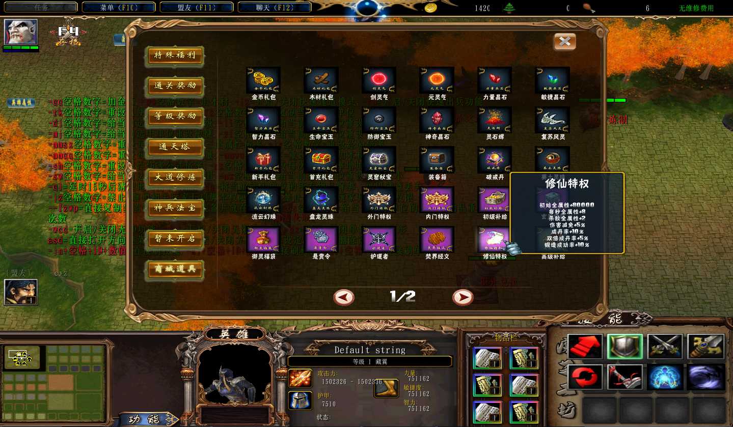 | 技能菜单【光环类技能】 | 自动化菜单【自动加钱木,提升英雄三围】 |