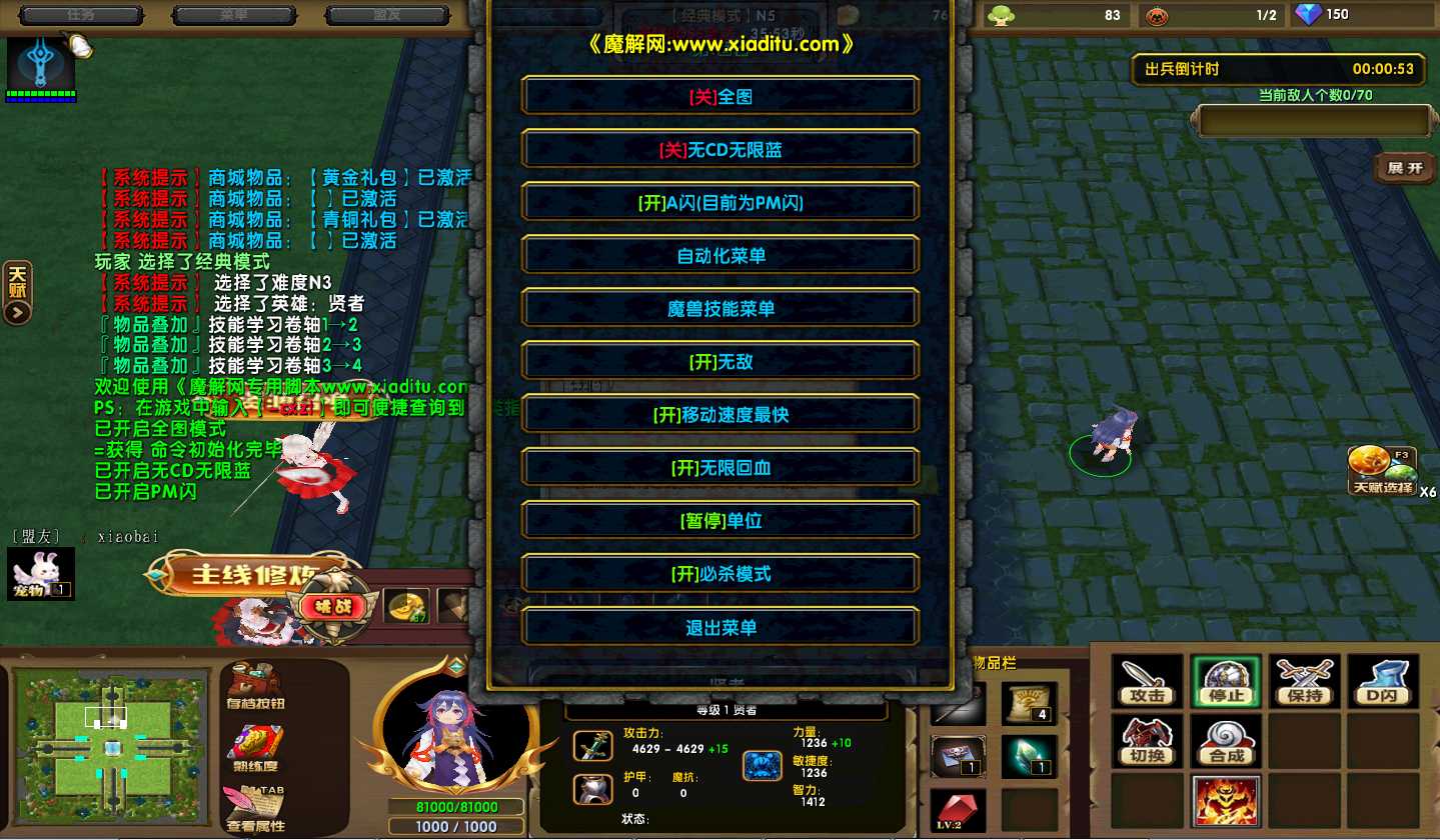 | 技能菜单【光环类技能】 | 自动化菜单【自动加钱木,提升英雄三围】 |