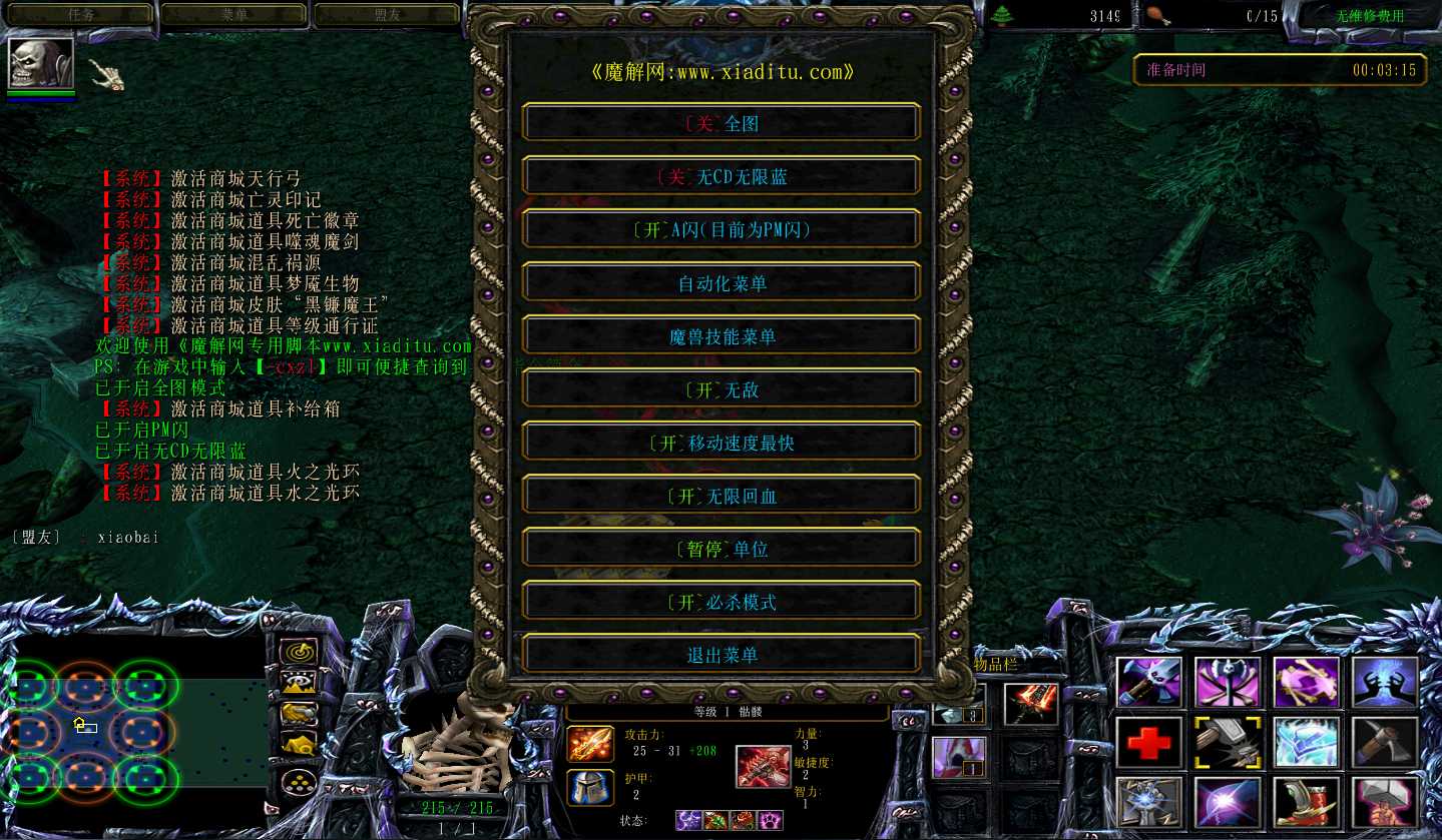 | 技能菜单【光环类技能】 | 自动化菜单【自动加钱木,提升英雄三围】 |