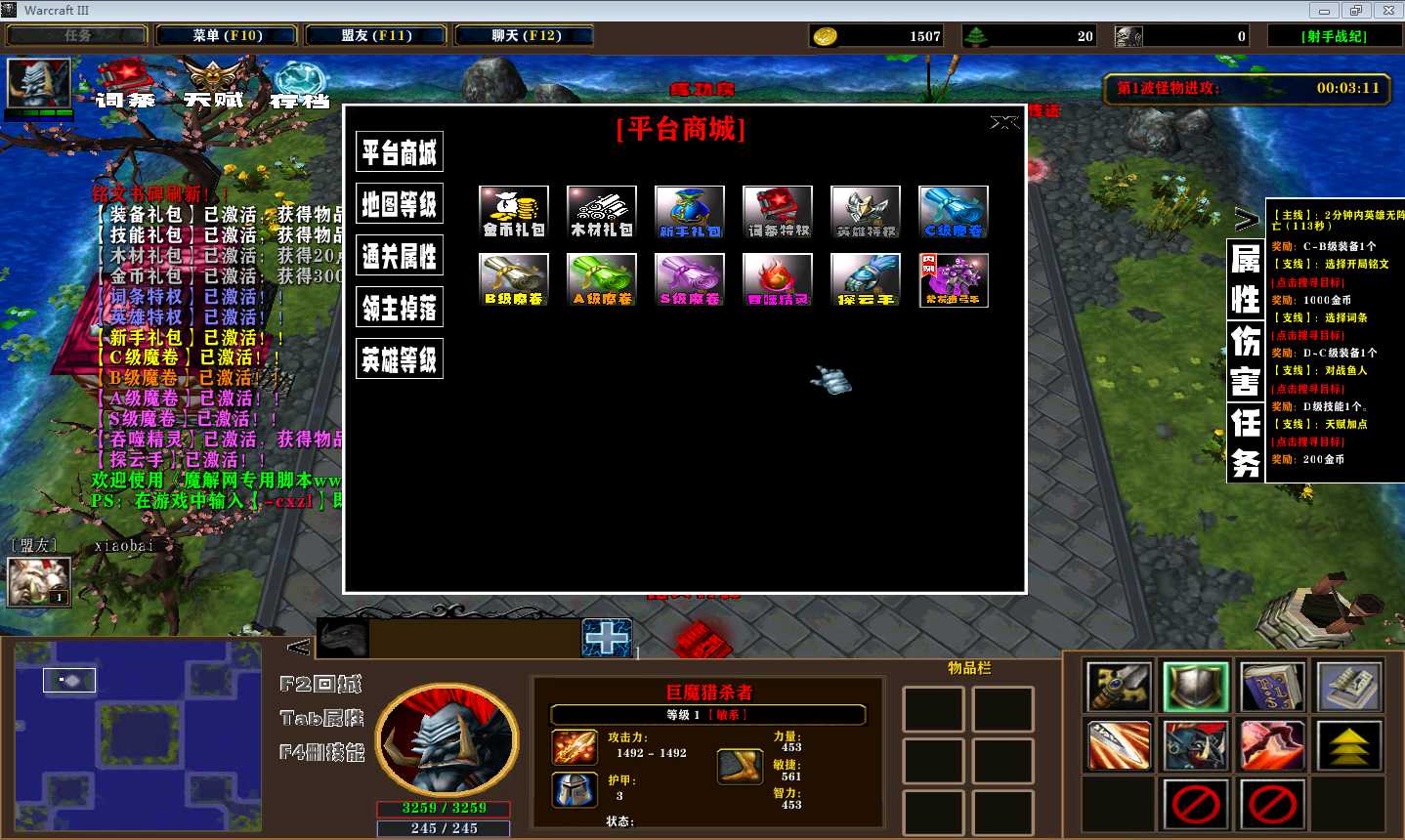 | 技能菜单【光环类技能】 | 自动化菜单【自动加钱木,提升英雄三围】 |