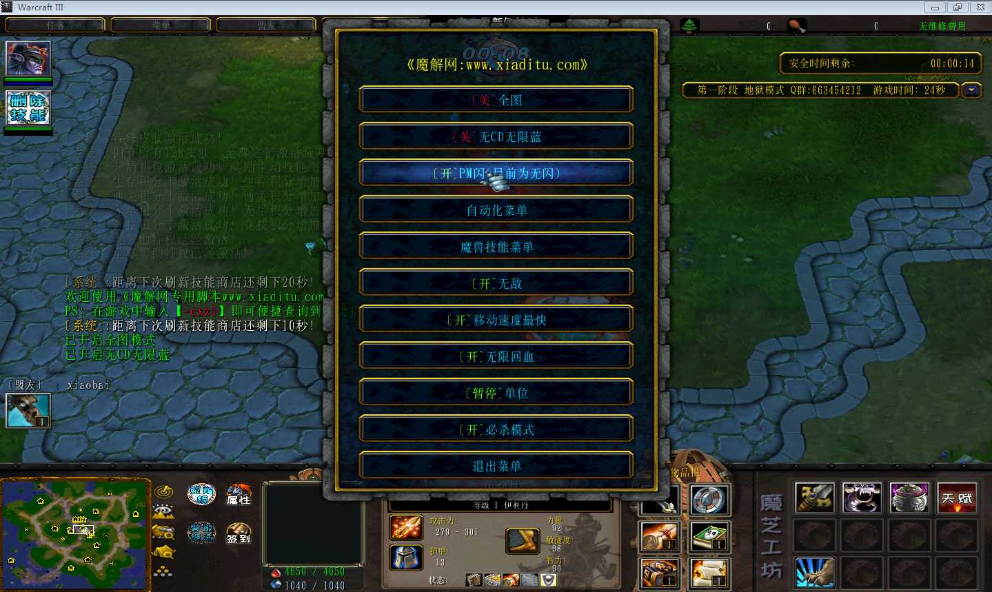 | 技能菜单【光环类技能】 | 自动化菜单【自动加钱木,提升英雄三围】 |