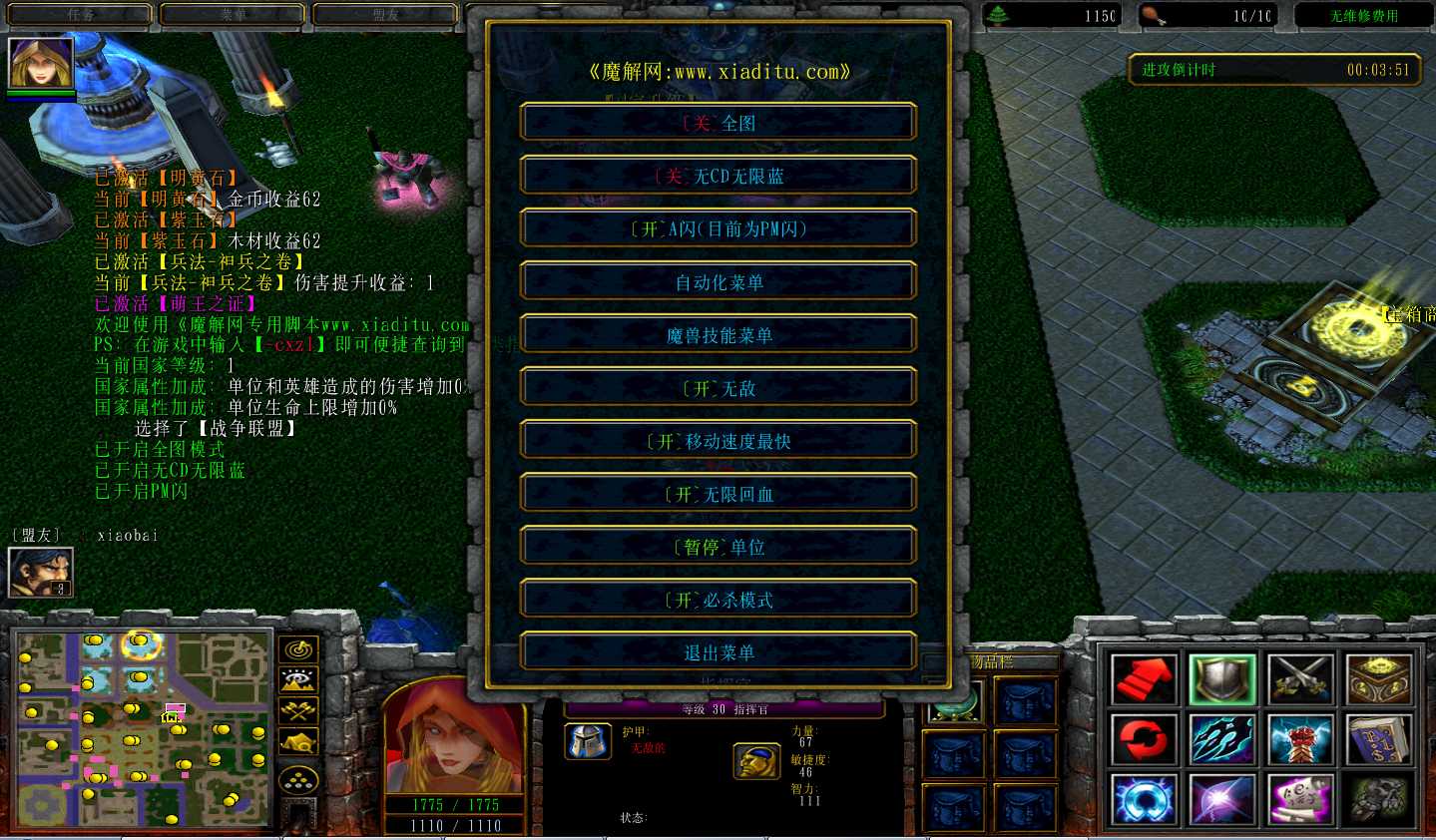 | 技能菜单【光环类技能】 | 自动化菜单【自动加钱木,提升英雄三围】 |