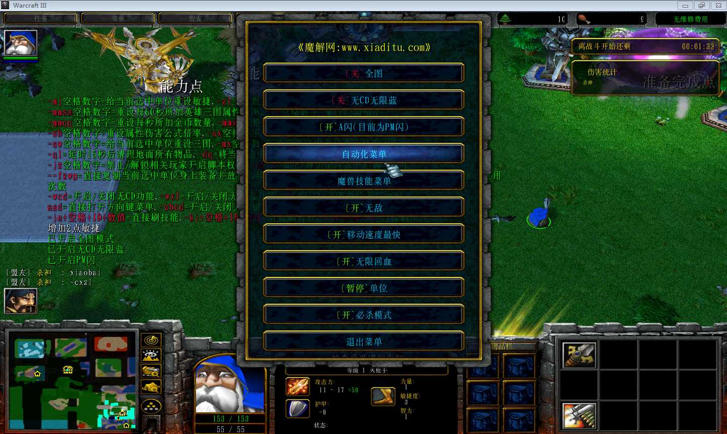 | 技能菜单【光环类技能】 | 自动化菜单【自动加钱木,提升英雄三围】 |