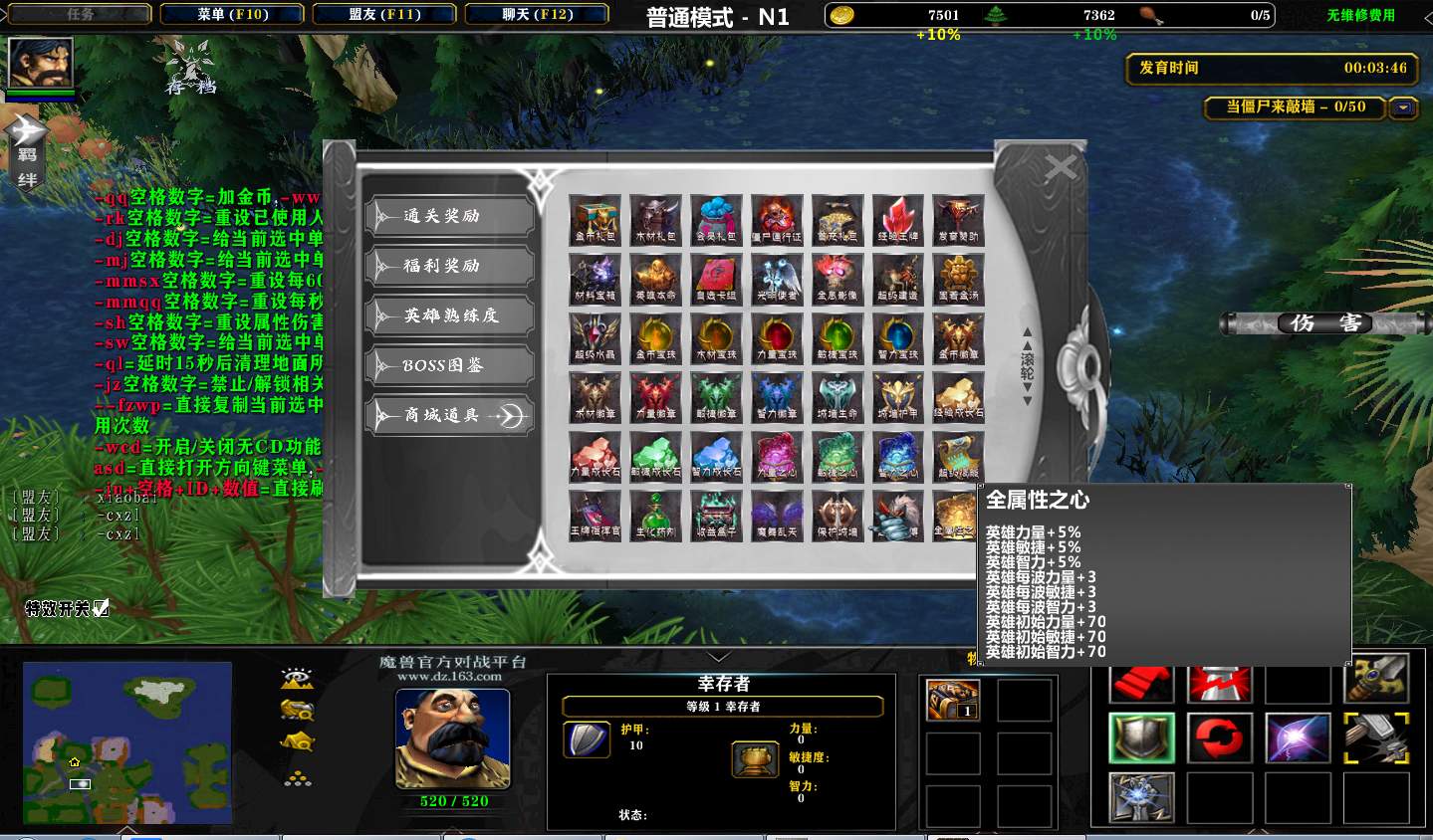 | 技能菜单【光环类技能】 | 自动化菜单【自动加钱木,提升英雄三围】 |