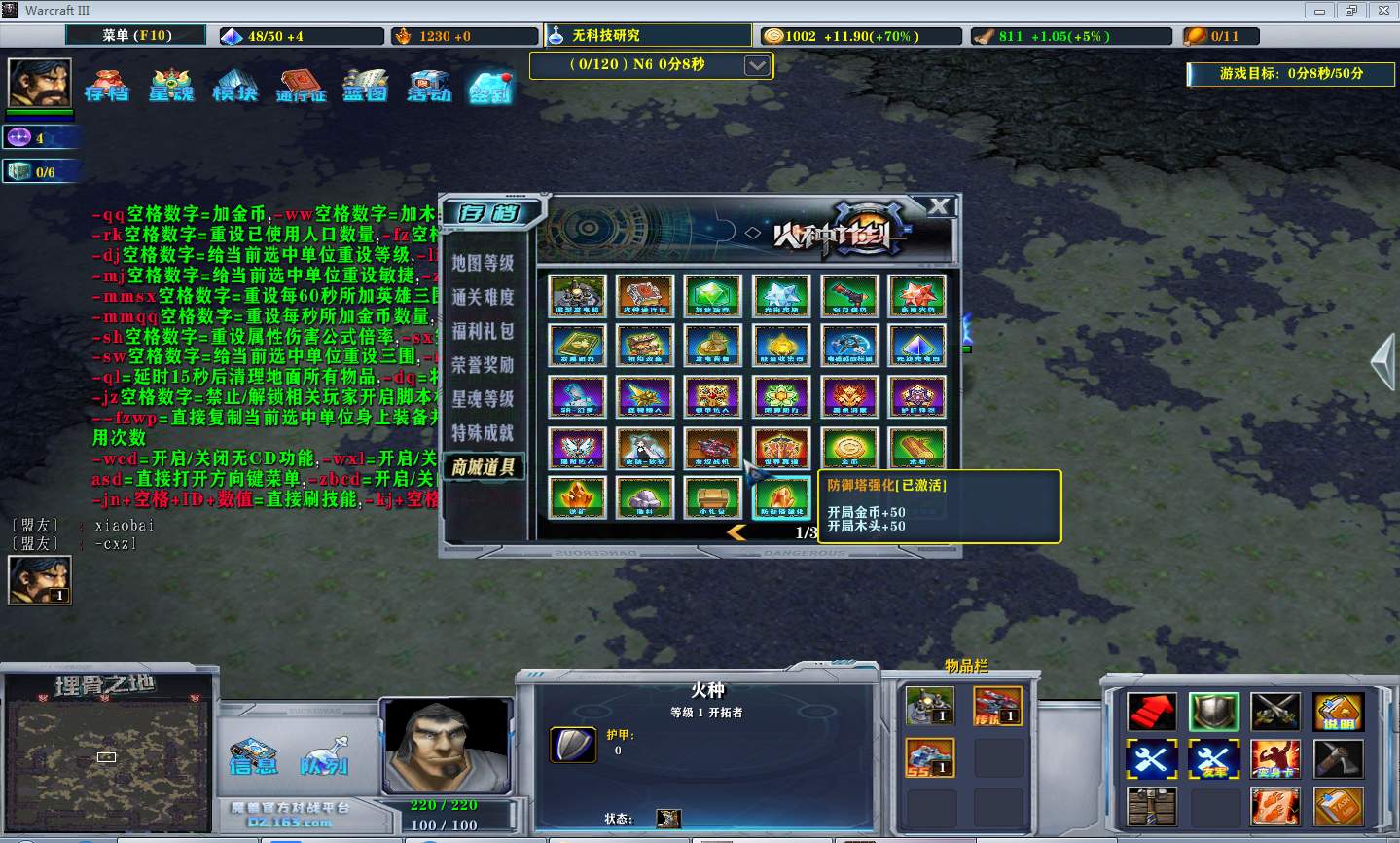 | 技能菜单【光环类技能】 | 自动化菜单【自动加钱木,提升英雄三围】 |