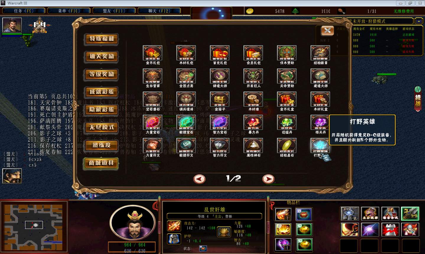 | 技能菜单【光环类技能】 | 自动化菜单【自动加钱木,提升英雄三围】 |