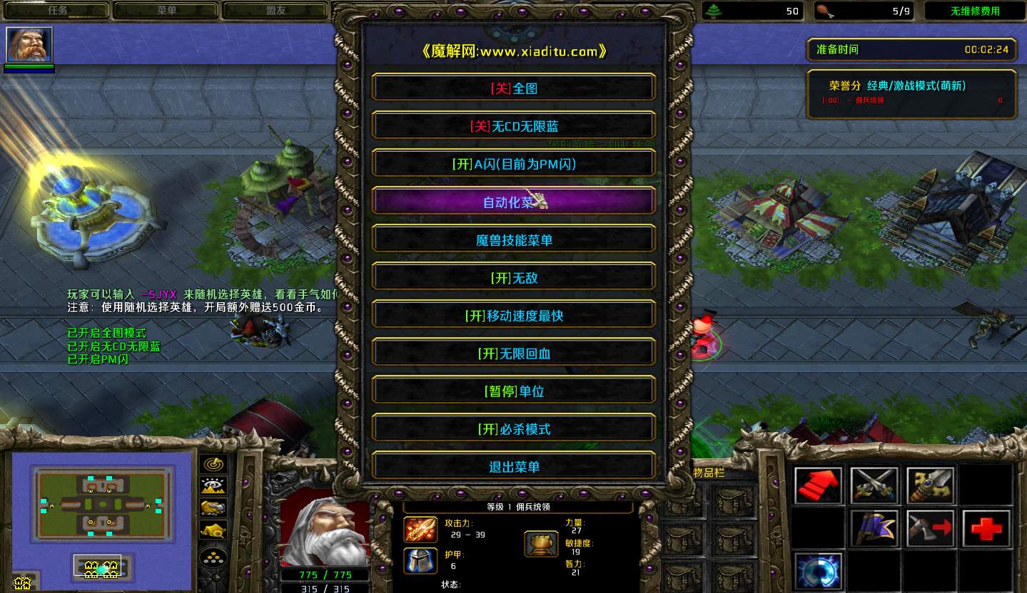 | 技能菜单【光环类技能】 | 自动化菜单【自动加钱木,提升英雄三围】 |