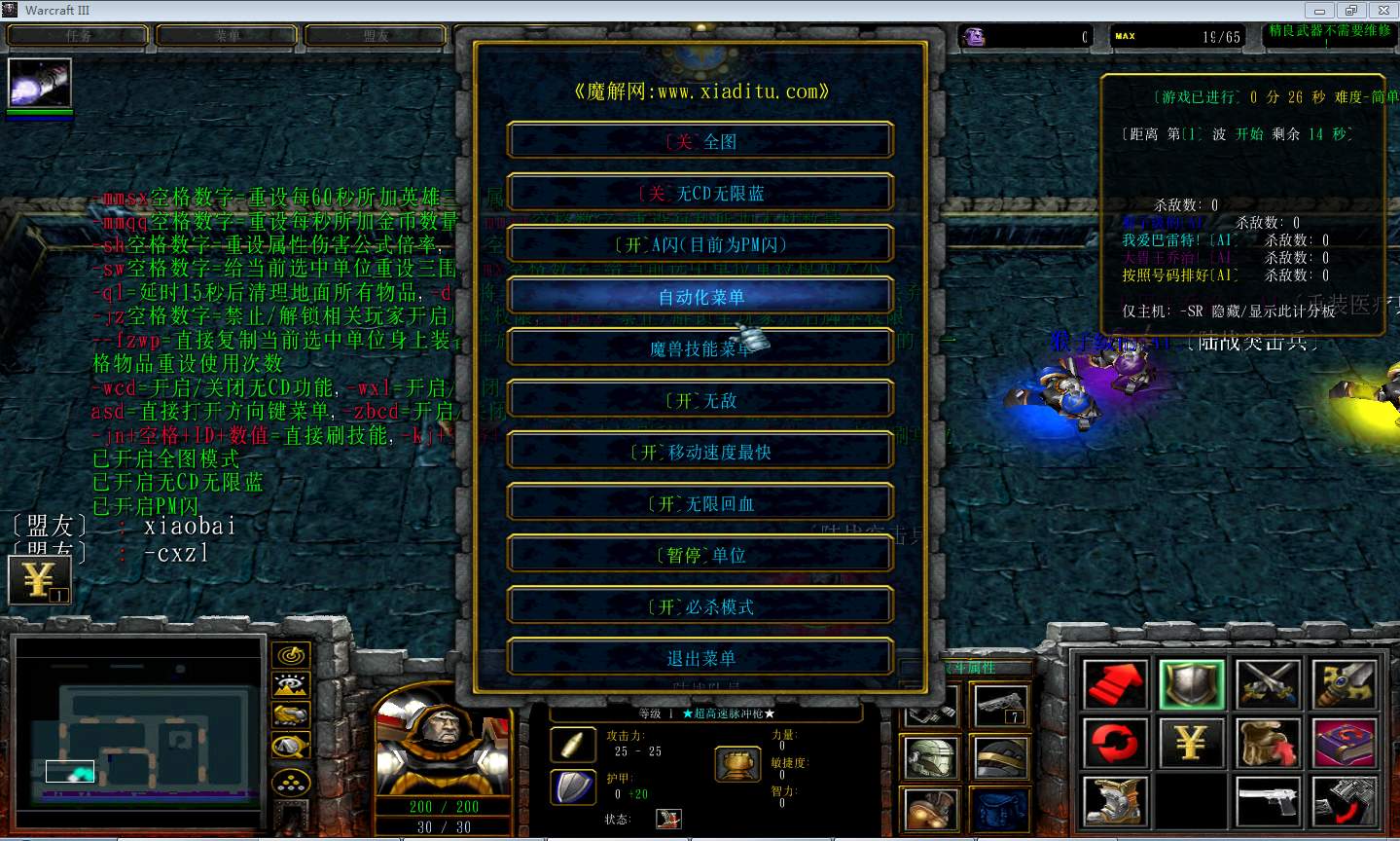 | 技能菜单【光环类技能】 | 自动化菜单【自动加钱木,提升英雄三围】 |
