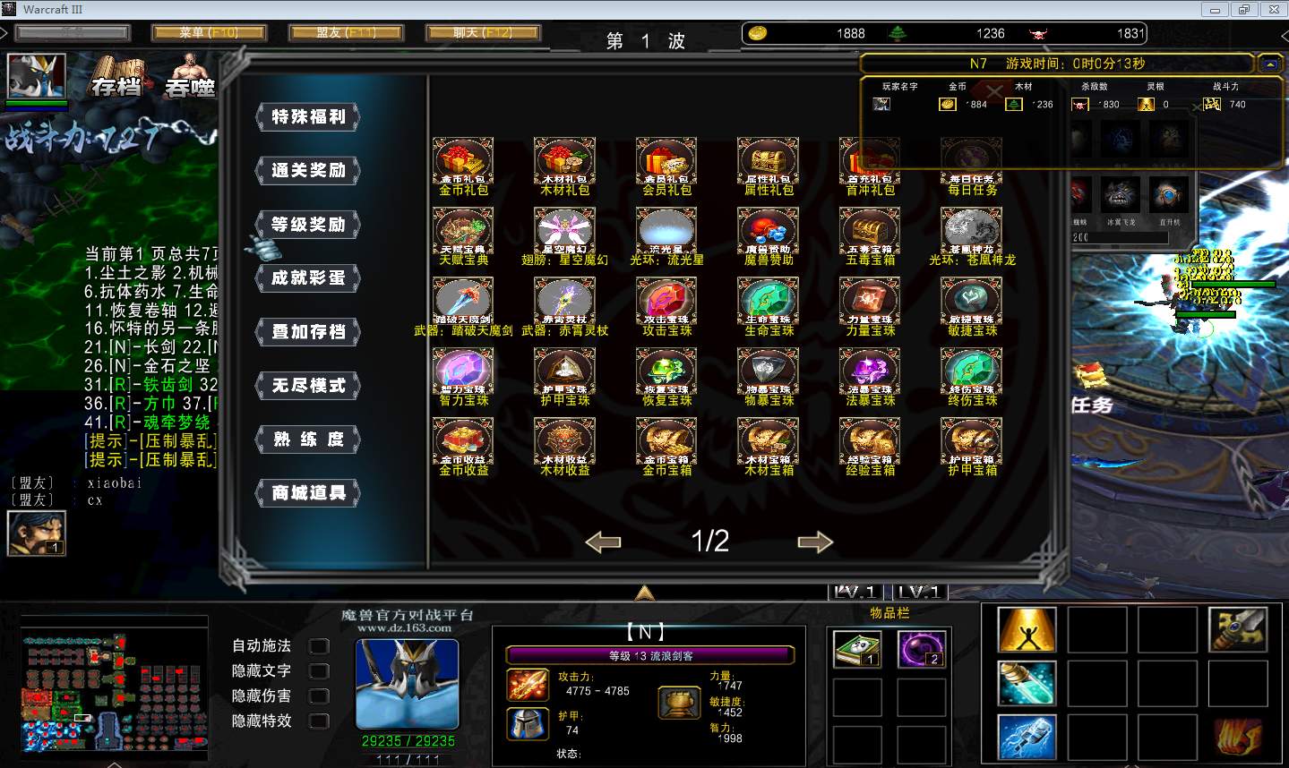 | 技能菜单【光环类技能】 | 自动化菜单【自动加钱木,提升英雄三围】 |