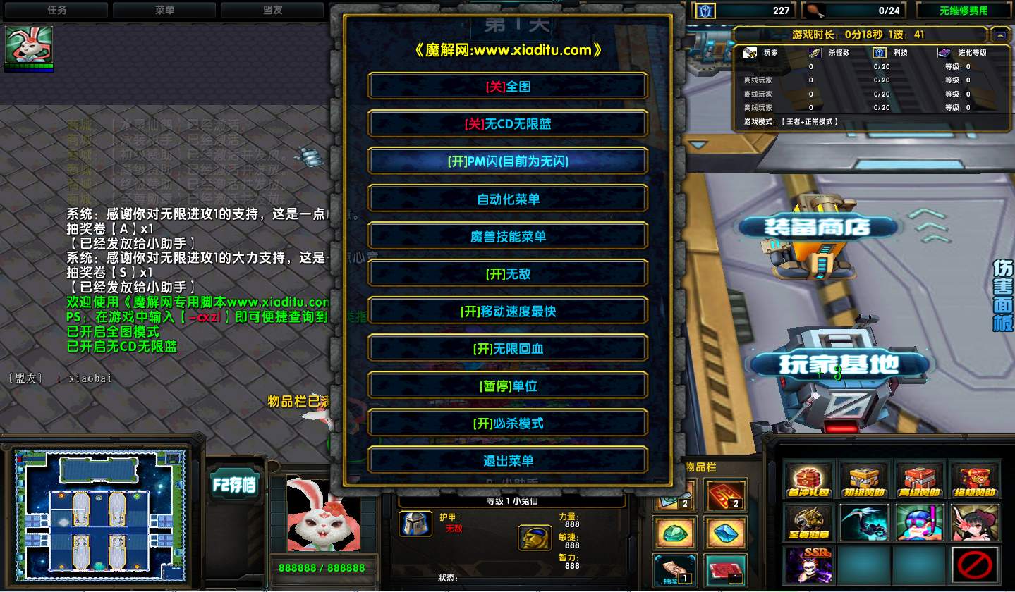 | 技能菜单【光环类技能】 | 自动化菜单【自动加钱木,提升英雄三围】 |