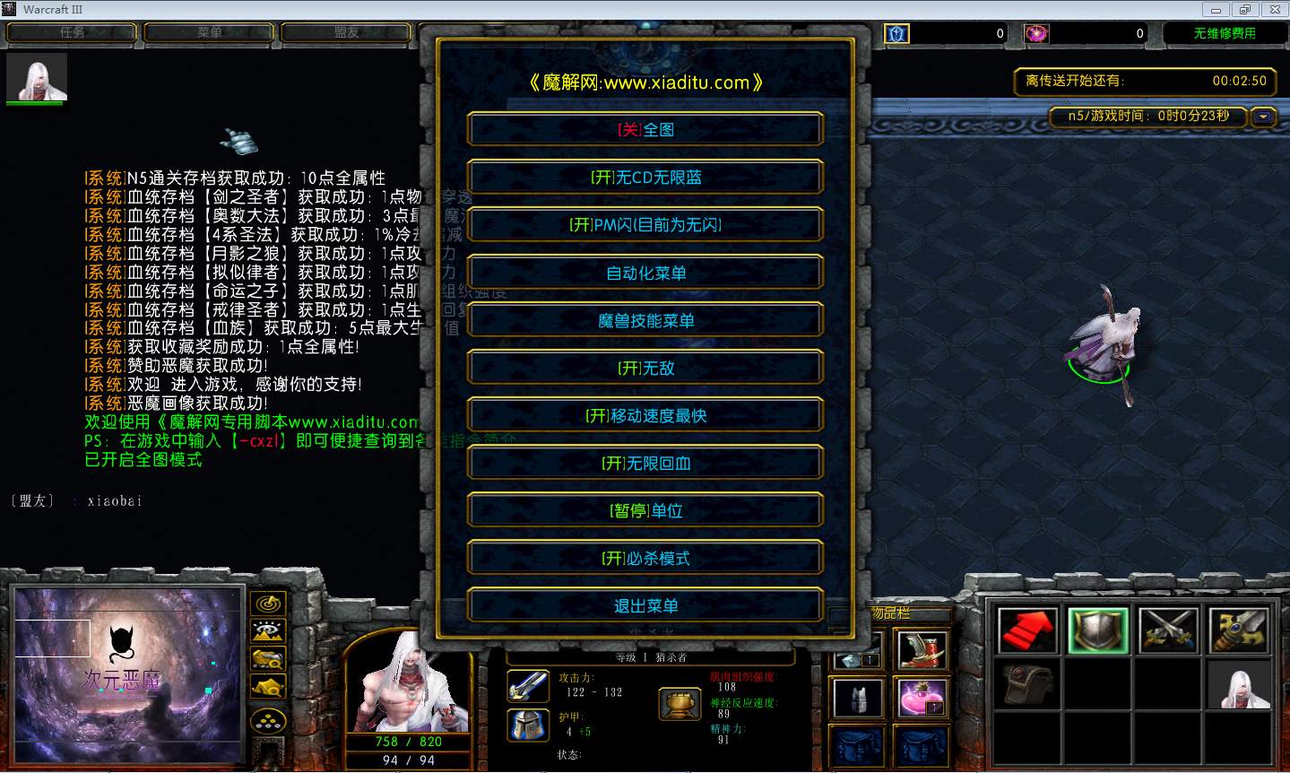 | 技能菜单【光环类技能】 | 自动化菜单【自动加钱木,提升英雄三围】 |