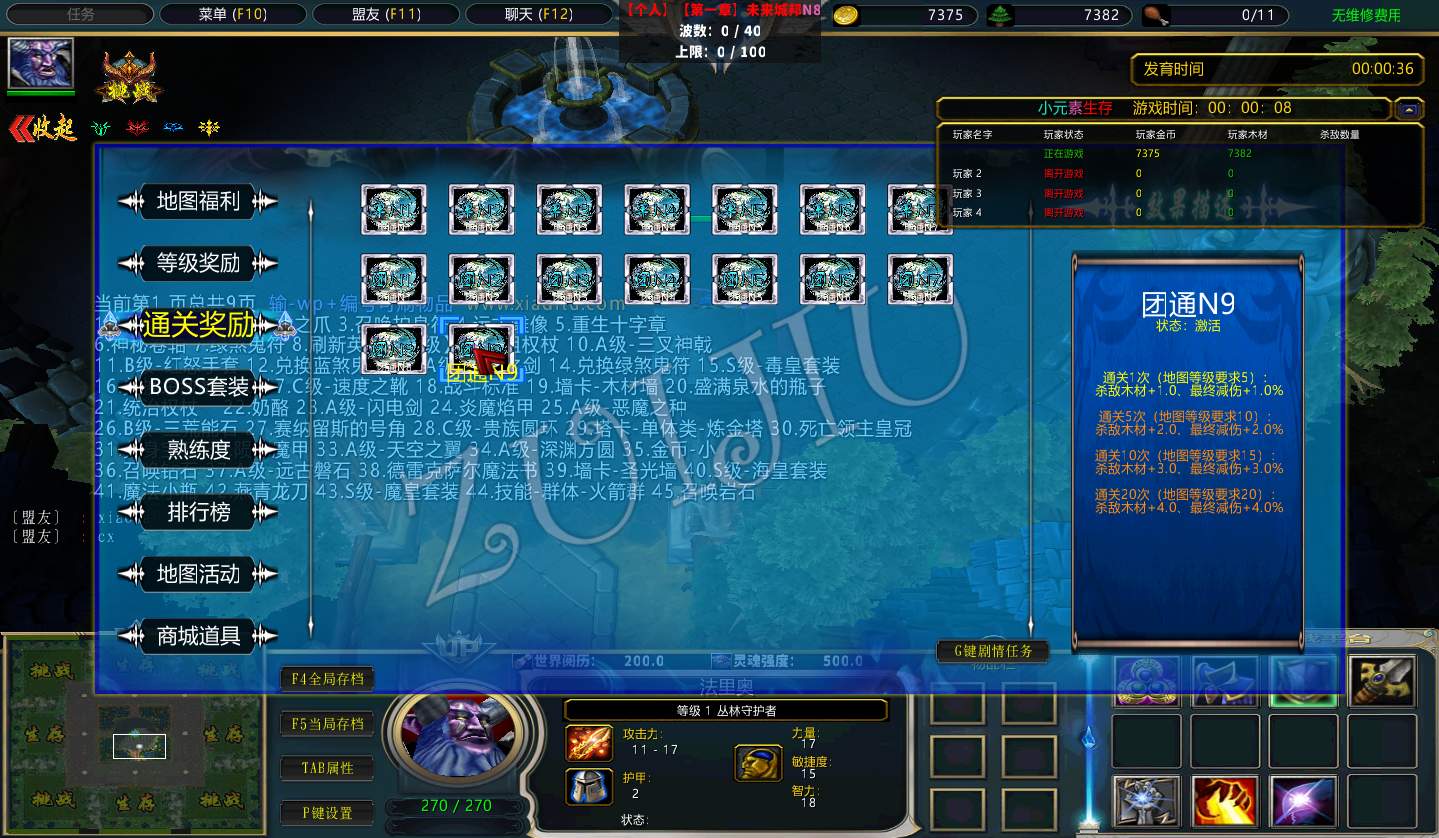 | 技能菜单【光环类技能】 | 自动化菜单【自动加钱木,提升英雄三围】 |