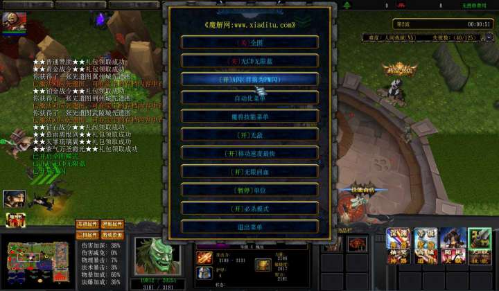 | 技能菜单【光环类技能】 | 自动化菜单【自动加钱木,提升英雄三围】 |
