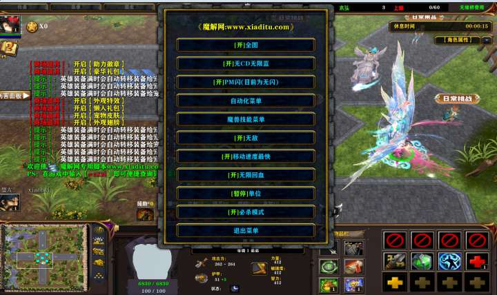 | 技能菜单【光环类技能】 | 自动化菜单【自动加钱木,提升英雄三围】 |