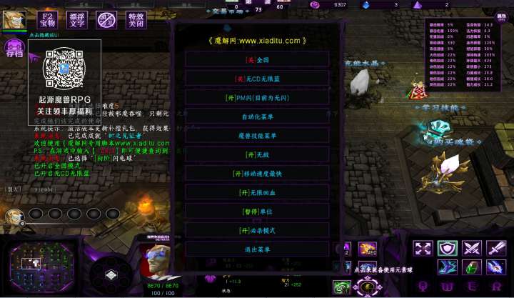 | 技能菜单【光环类技能】 | 自动化菜单【自动加钱木,提升英雄三围】 |