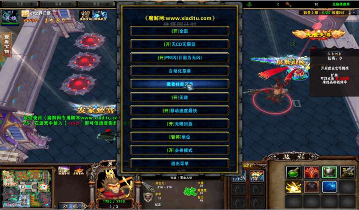 | 技能菜单【光环类技能】 | 自动化菜单【自动加钱木,提升英雄三围】 |