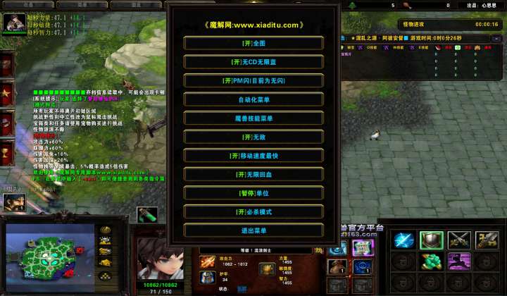 | 技能菜单【光环类技能】 | 自动化菜单【自动加钱木,提升英雄三围】 |