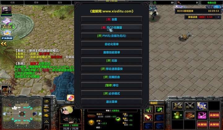 | 技能菜单【光环类技能】 | 自动化菜单【自动加钱木,提升英雄三围】 |