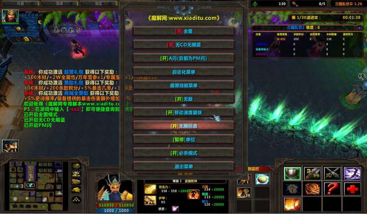 | 技能菜单【光环类技能】 | 自动化菜单【自动加钱木,提升英雄三围】 |