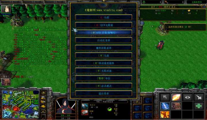 | 技能菜单【光环类技能】 | 自动化菜单【自动加钱木,提升英雄三围】 |