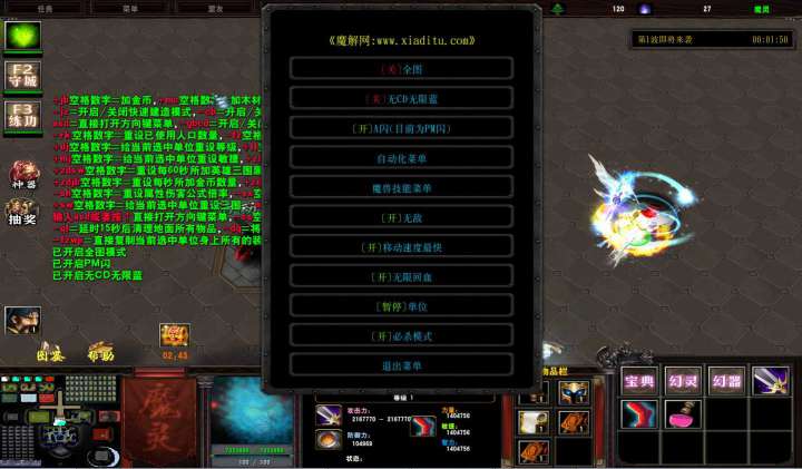 | 技能菜单【光环类技能】 | 自动化菜单【自动加钱木,提升英雄三围】 |