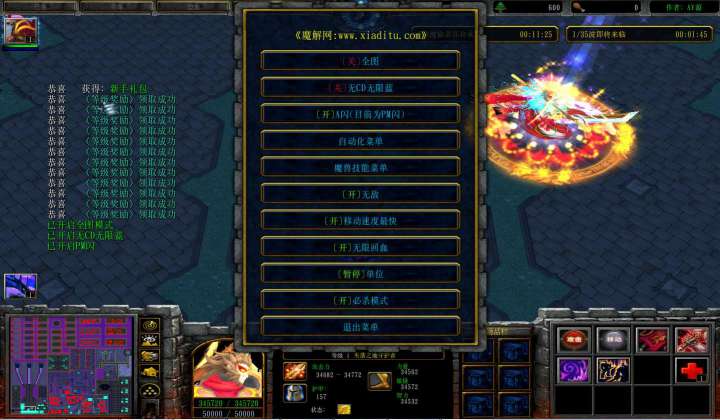 | 技能菜单【光环类技能】 | 自动化菜单【自动加钱木,提升英雄三围】 |