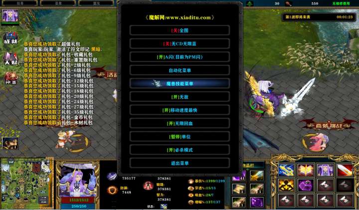 | 技能菜单【光环类技能】 | 自动化菜单【自动加钱木,提升英雄三围】 |