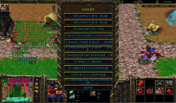 | 技能菜单【光环类技能】 | 自动化菜单【自动加钱木,提升英雄三围】 |