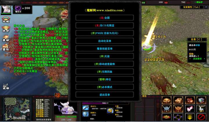 | 技能菜单【光环类技能】 | 自动化菜单【自动加钱木,提升英雄三围】 |