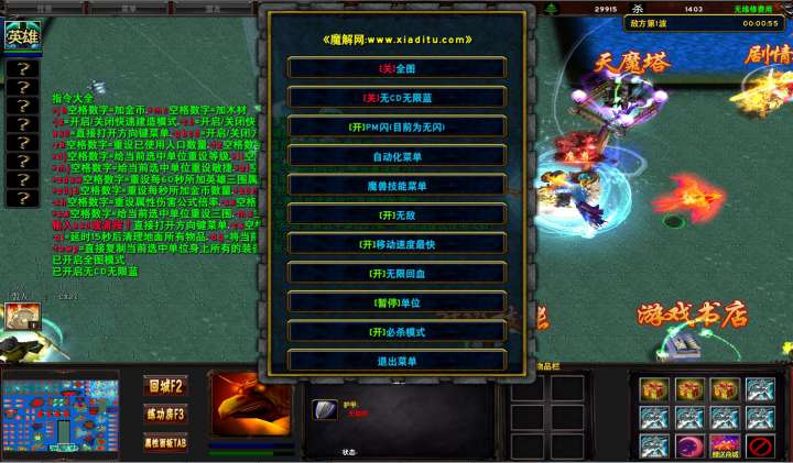 | 技能菜单【光环类技能】 | 自动化菜单【自动加钱木,提升英雄三围】 |