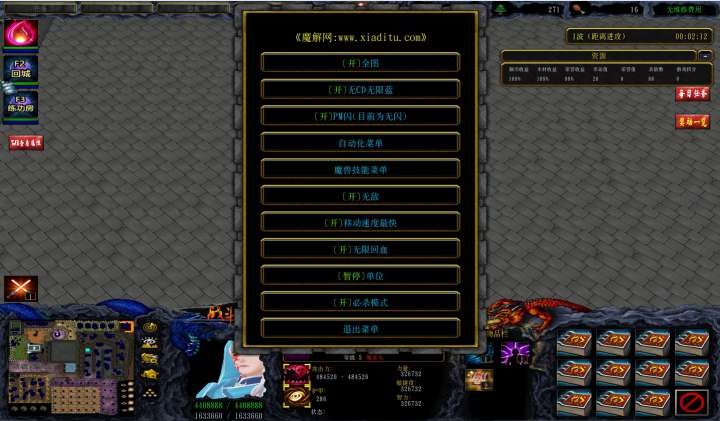 | 技能菜单【光环类技能】 | 自动化菜单【自动加钱木,提升英雄三围】 |