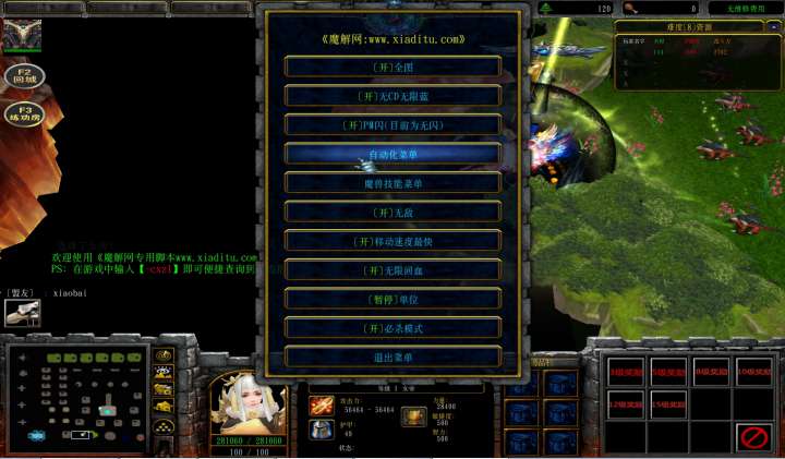 | 技能菜单【光环类技能】 | 自动化菜单【自动加钱木,提升英雄三围】 |