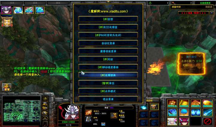 | 技能菜单【光环类技能】 | 自动化菜单【自动加钱木,提升英雄三围】 |