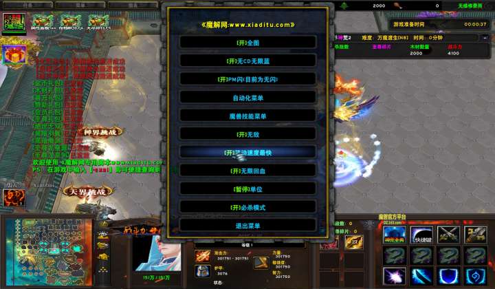 | 技能菜单【光环类技能】 | 自动化菜单【自动加钱木,提升英雄三围】 |