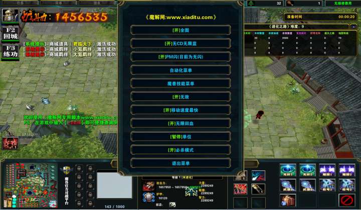 | 技能菜单【光环类技能】 | 自动化菜单【自动加钱木,提升英雄三围】 |