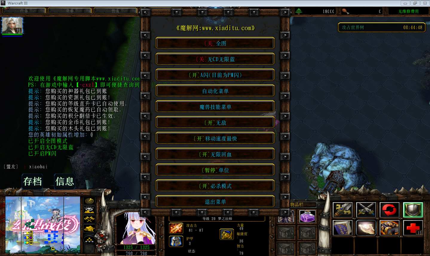 | 技能菜单【光环类技能】 | 自动化菜单【自动加钱木,提升英雄三围】 |