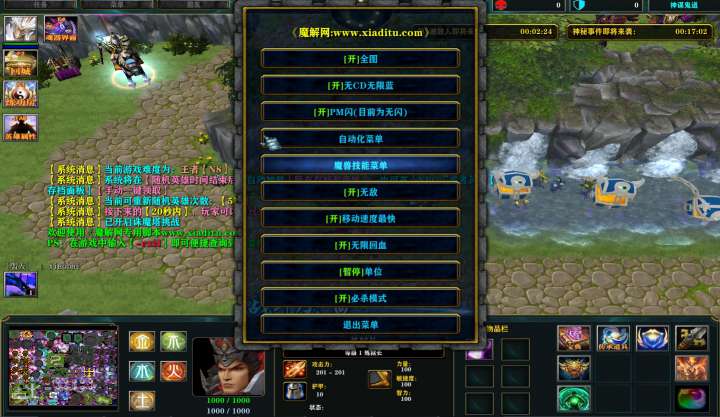 | 技能菜单【光环类技能】 | 自动化菜单【自动加钱木,提升英雄三围】 |