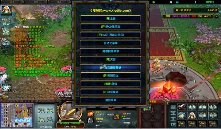 | 技能菜单【光环类技能】 | 自动化菜单【自动加钱木,提升英雄三围】 |
