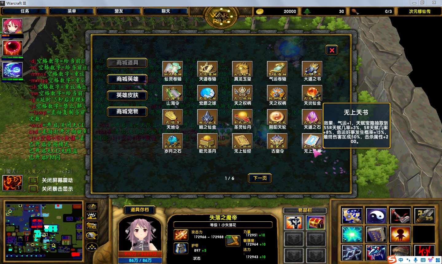 地图名字:次元修仙传v2.5.137地图下载+全商城特权+全存档+隐藏英雄+无CD+指令功能