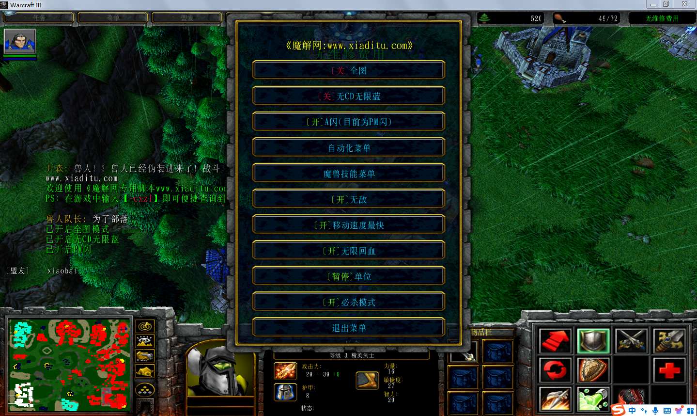 | 技能菜单【光环类技能】 | 自动化菜单【自动加钱木,提升英雄三围】 |