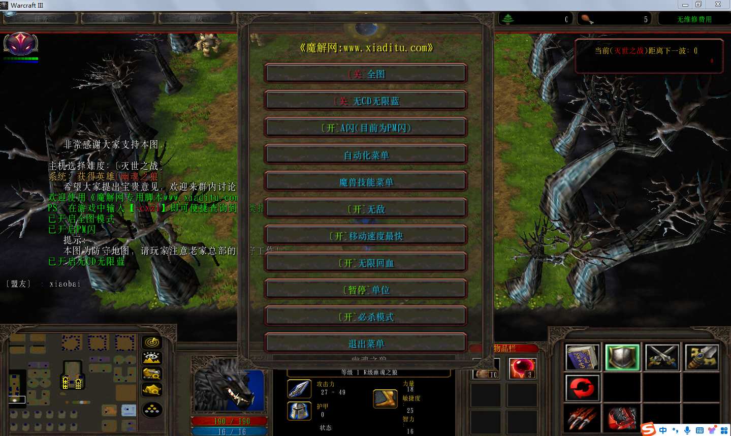 | 技能菜单【光环类技能】 | 自动化菜单【自动加钱木,提升英雄三围】 |