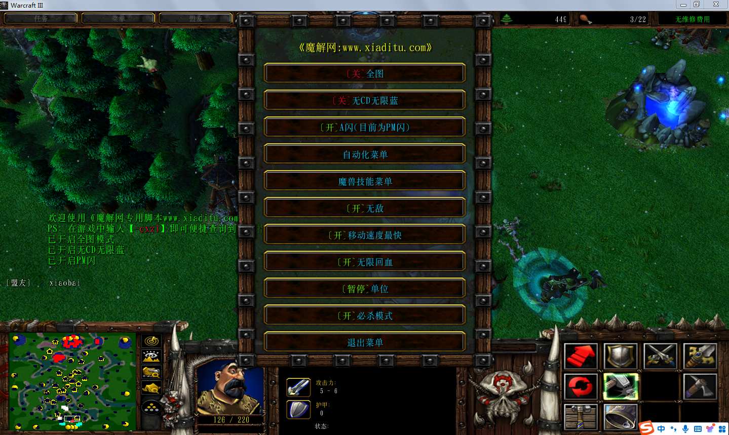 | 技能菜单【光环类技能】 | 自动化菜单【自动加钱木,提升英雄三围】 |