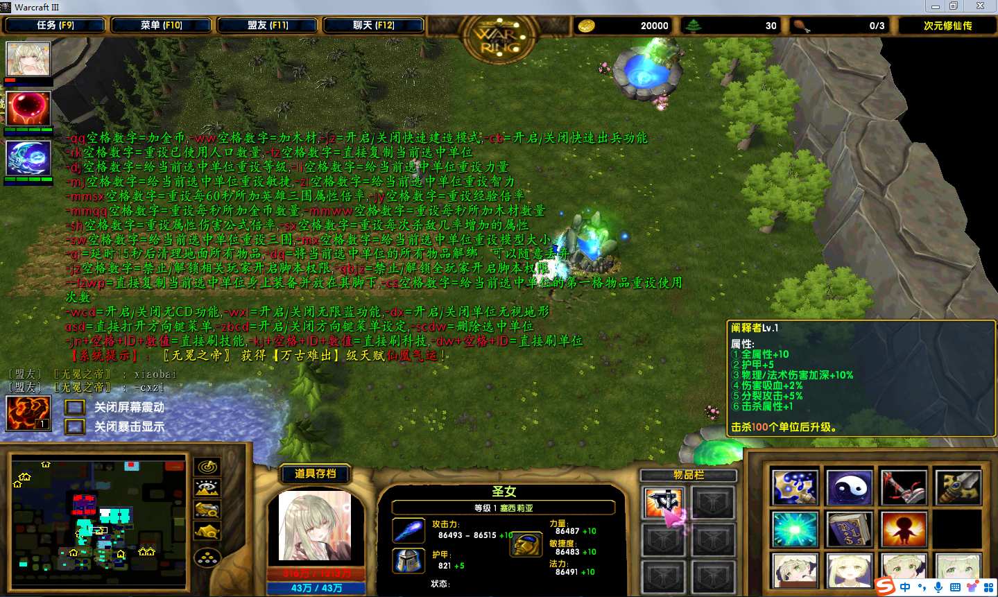 地图名字:次元修仙传v2.5.139地图下载+全商城特权+全存档+隐藏英雄+无CD+指令功能