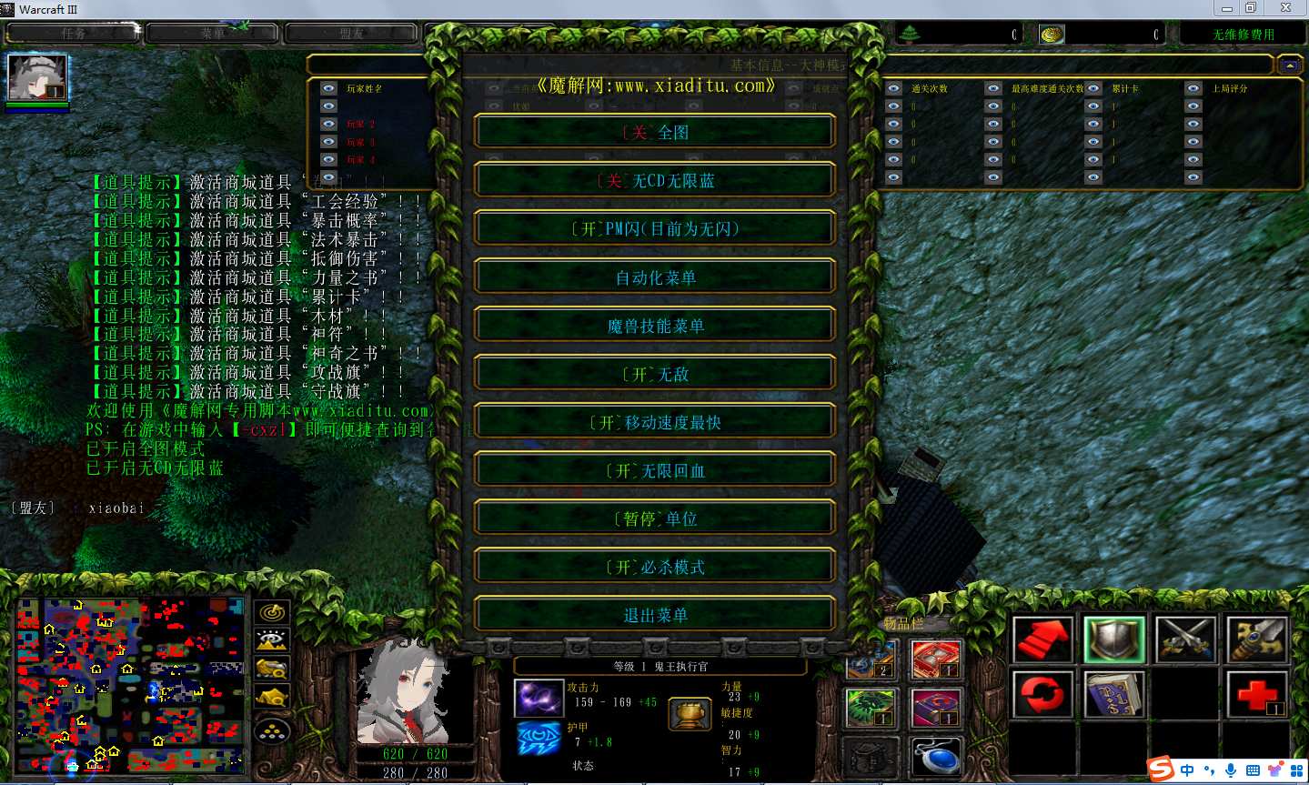 | 技能菜单【光环类技能】 | 自动化菜单【自动加钱木,提升英雄三围】 |