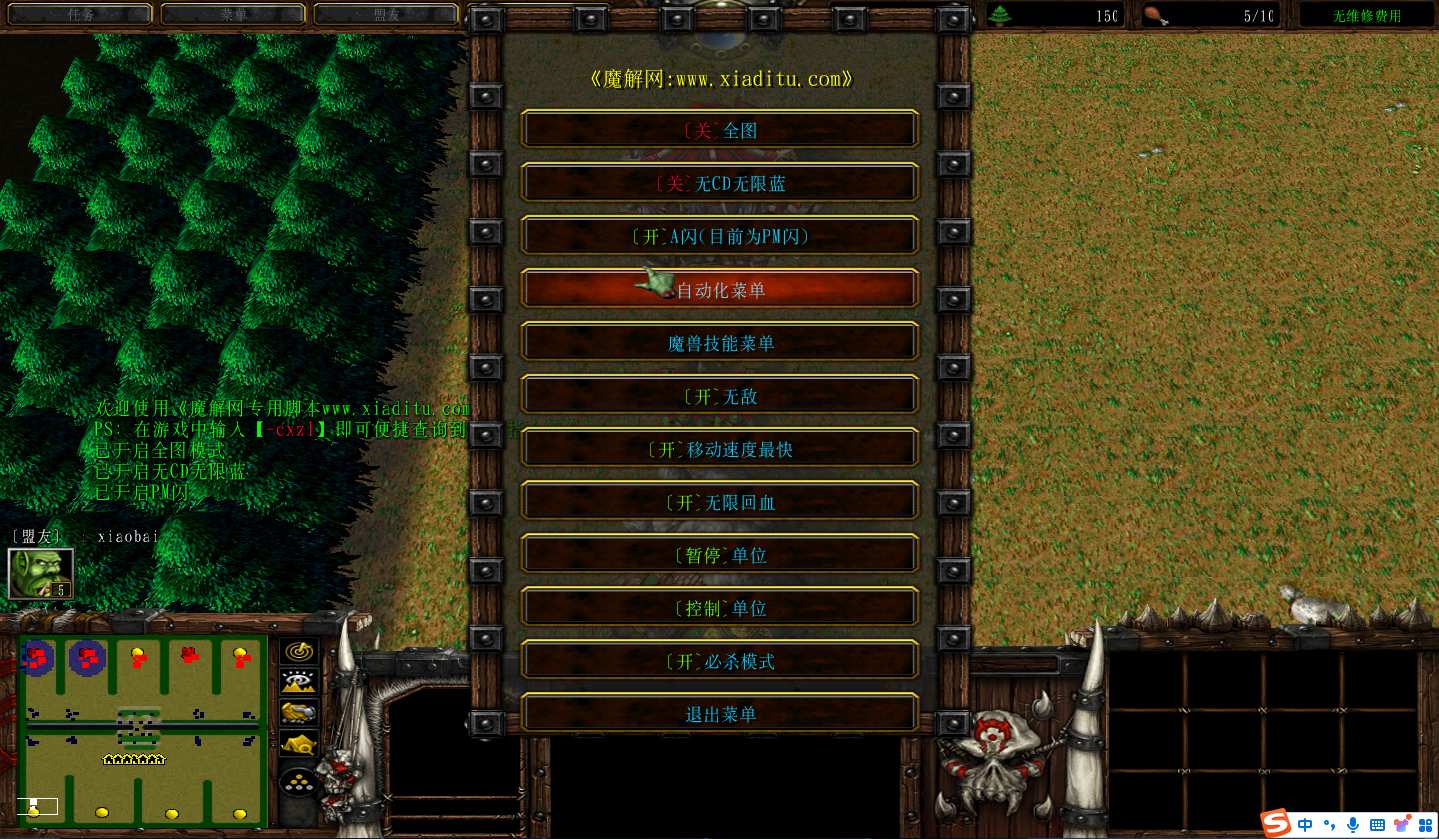 | 技能菜单【光环类技能】 | 自动化菜单【自动加钱木,提升英雄三围】 |