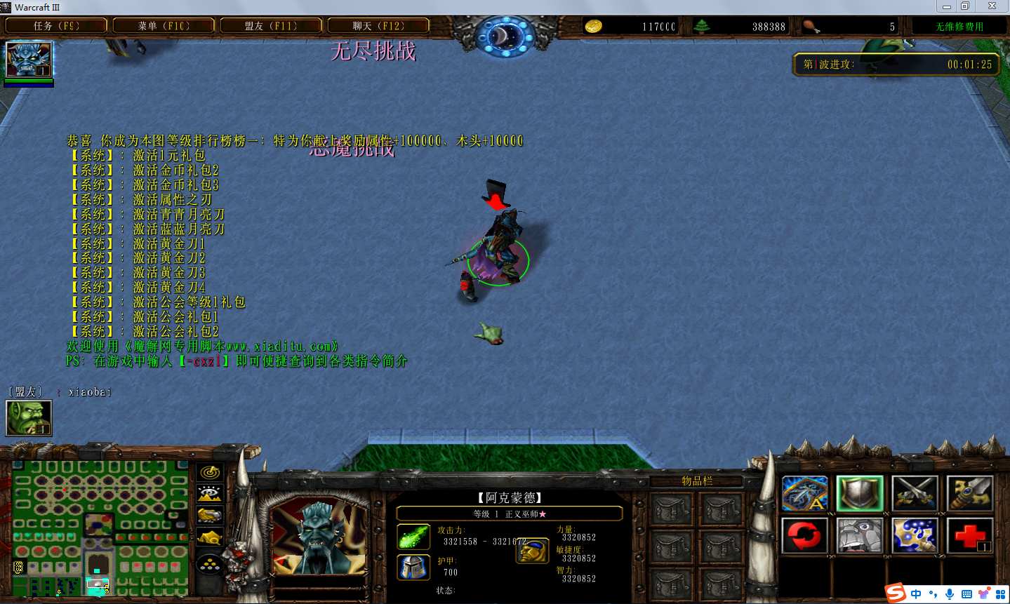 | 技能菜单【光环类技能】 | 自动化菜单【自动加钱木,提升英雄三围】 |