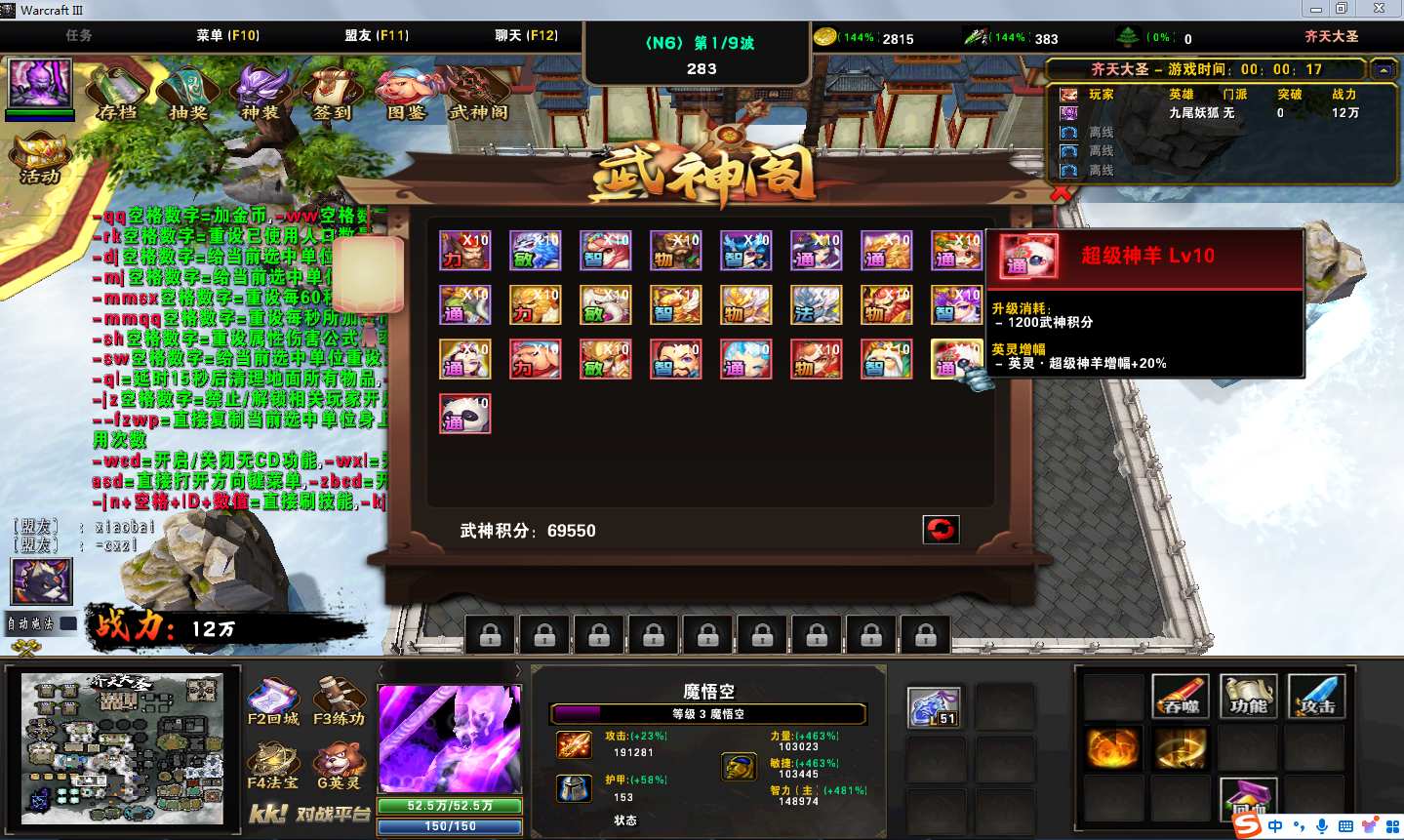 地图名字:齐天大圣1.0.31地图下载+全商城特权+全存档+隐藏英雄+无CD+指令功能