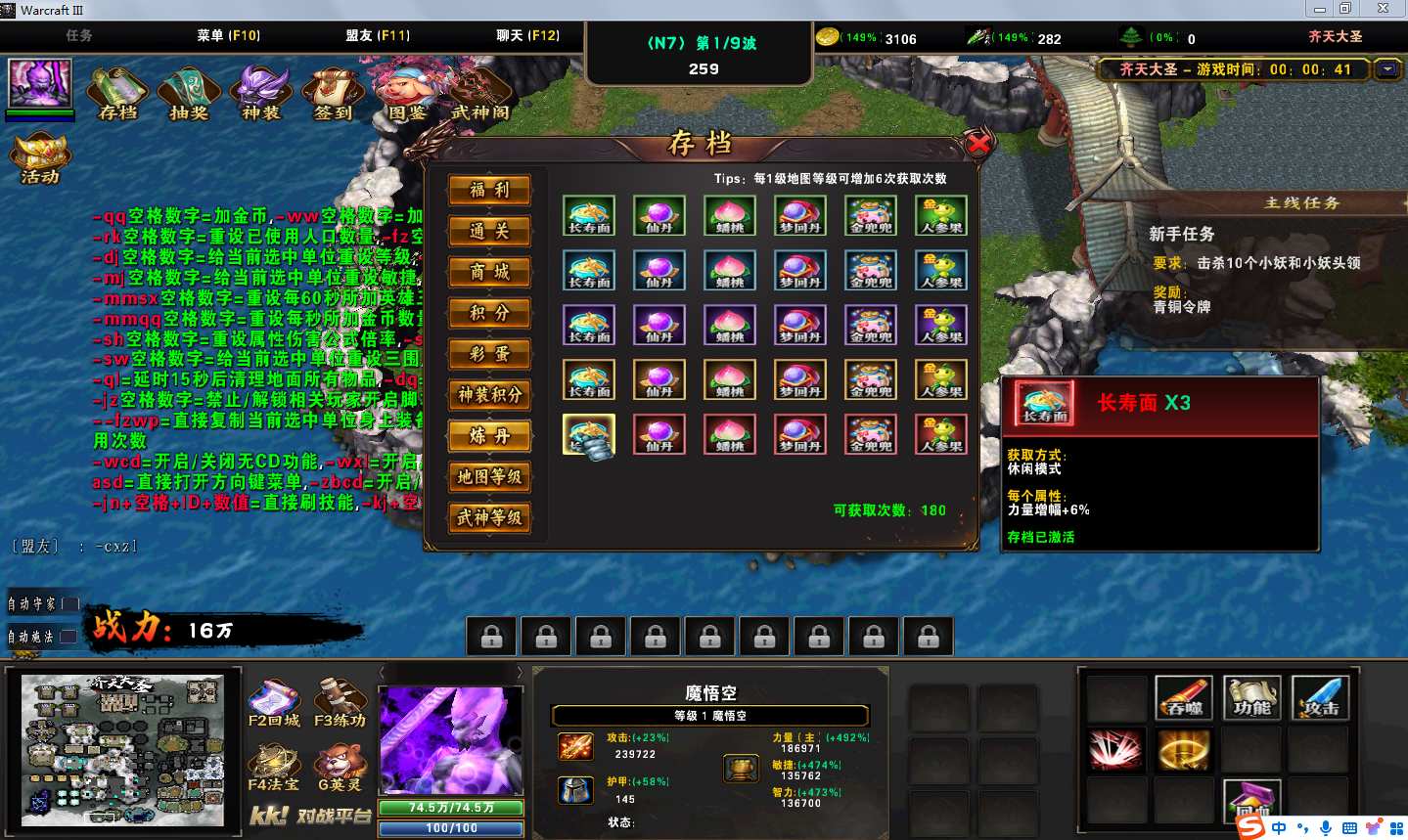 地图名字:齐天大圣1.0.33白地图下载+全商城特权+全存档+隐藏英雄+无CD+指令功能
