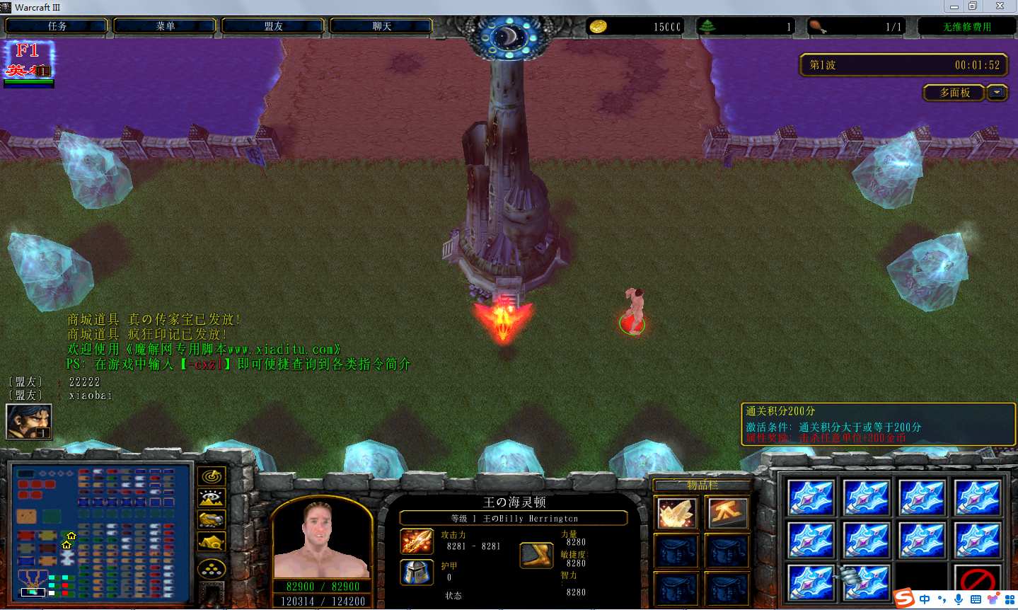 地图名字:巅峰之战1.1.4地图下载+全商城特权+全存档+隐藏英雄+无CD+指令功能