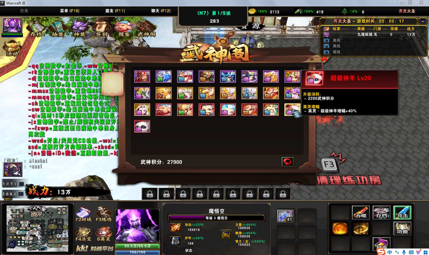 地图名字:齐天大圣1.0.36地图下载+全商城特权+全存档+隐藏英雄+无CD+指令功能